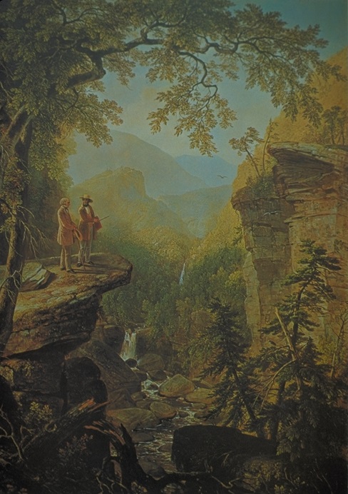 DURAND'S KINDRED SPIRITS This is Asher Durand's painting titled "Kindred Spirits." William Cullen Bryant and Thomas Cole are shown in the painting. It has been noted that early 19th century painters saw human forms in nature around them. J. Gray Sweeney at Arizona State University has written about this. Sweeney's article in the "Smithsonian Studies in American Art" [Fall 1989, Volume 3, Number 4, p. 43] also refers to David C. Huntington's work. Sweeney points out that the cliff in this painting suggests a human face. Bryant is pointing at the face in the cliff. |