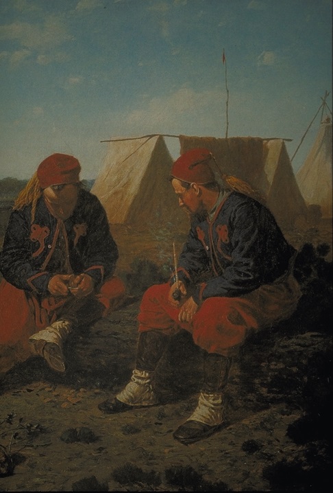 WINSLOW HOMER - THE BRIARWOOD PIPE 1864 This is Homer's painting The Briarwood Pipe. These soldiers have a very distinctive uniform. They are from a Zouave unit during the Civil War. Become familiar with their colors. Note that the coats are blue, but that in bright light blue may appear gray. The brightest parts of their blue shirts appear gray. |