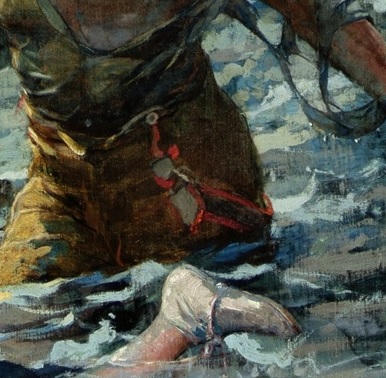 WINSLOW HOMER - UNDERTOW (detail) On this lifeguards hip, I see the image of two Zouave soldiers. One Zouave soldier appears to be dragging another fallen Zouave soldier. That is "what the thing is not." I do not know what these colorful objects might actually be in the context of the painting. The top Zouave, with his left arm up, holding onto the lifeguard's button [if we can flip between realities]e appears to be pulling, or towing, something, perhaps a fallen Zouave soldier. The form of the top soldier seems clear. He is standing, bent over. The colors are distinctly Zouave colors. A suggestion of the Zouave image is there, but the form of the lower part is not clear. |