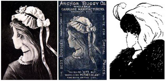 YOUNG GIRL/OLD WOMAN or WIFE/MOTHER-IN-LAW ILLUSION Here are various versions of another switching image. On the far right is psychologist E. G. Boring's famous "Wife/Mother-in-Law" image, often found reproduced in perception textbooks. When you see a young woman looking away, much like Hunt's lost profile or the sister we saw in one of Allston's paintings, you are seeing Boring's "wife image." When you can see the face of an old lady, an old hag, a witch-like image, you are seeing Boring's "mother-in-law image." The image on the left is thought to be the original. It was an anonymous German postcard from 1888. |