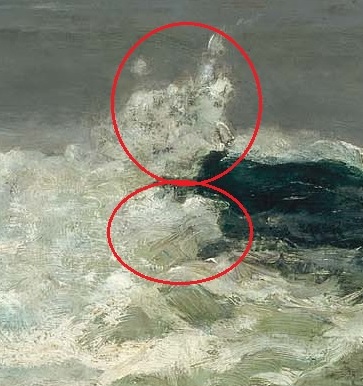 WINSLOW HOMER - DRIFTWOOD (detail) Without any image specific preparation, let me try to share some other images from the water of Driftwood, Homer's last painting. In the lower marking, is a man's face. Once you see it, it becomes quite distinct. In the upper marking is mere suggestion of a face, which is very sketchy at best. From his earliest childhood works to this final painting, the mother/father image pair has appeared in various works in a variety of forms. |