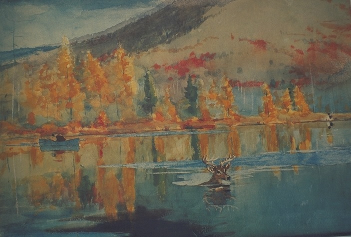 This is a watercolor, where a deer escapes the hunter in the boat.