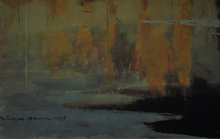 WINSLOW HOMER - AN OCTOBER DAY (detail)![]() On the right is a detail image from an area of the water. When I first looked at this section, it did not look like trees reflected in the water, which is what it should be in the context of the picture. Instead, that area seemed to be a self contained abstract representation. It appeared to be a scene with perspective and depth, people walking away. The black area made me think of a blood bath. They are walking away from us, and I imagine I see some with crutches. That reminded me of Homer's sketch "The Walking Wounded," although that sketch does not look anything like this image, its subject is the same. The deer escaping from the hunter is analogous to the walking wounded escaping from a blood bath. I wondered if the reflection matched the trees, so I rotated the full picture 90 degrees, in order to see whether the tree reflection is symmetrical. The reflection in the water does not match the trees on the shoreline. This hardly noticeable distortion of Nature is an indication that the reflection may actually represent something other than or in addition to the trees. These spectulative thoughts might be on track. At this point with this single instance, there is not enough to support any real conclusions, but it is possible that this is something Homer may have done in other works. We should remember this instance. A pattern might eventually emerge that could make this more plausible. |